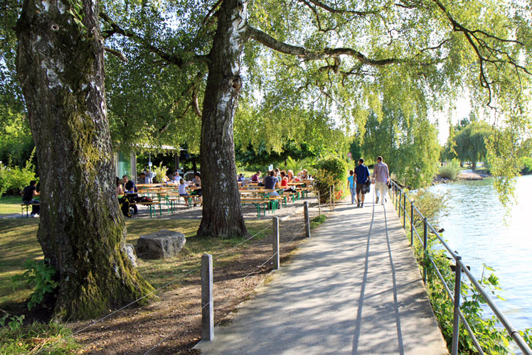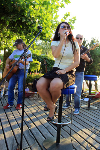 Der Einstieg ist heiss: Die Musiker tragen Sonnenbrillen und spielen überwiegend zügige Songs. Über dem See scheint die Sonne. Mit gespitzten Ohren und zugekniffenen Augen blinzeln die Zuhörer in Richtung Musik.