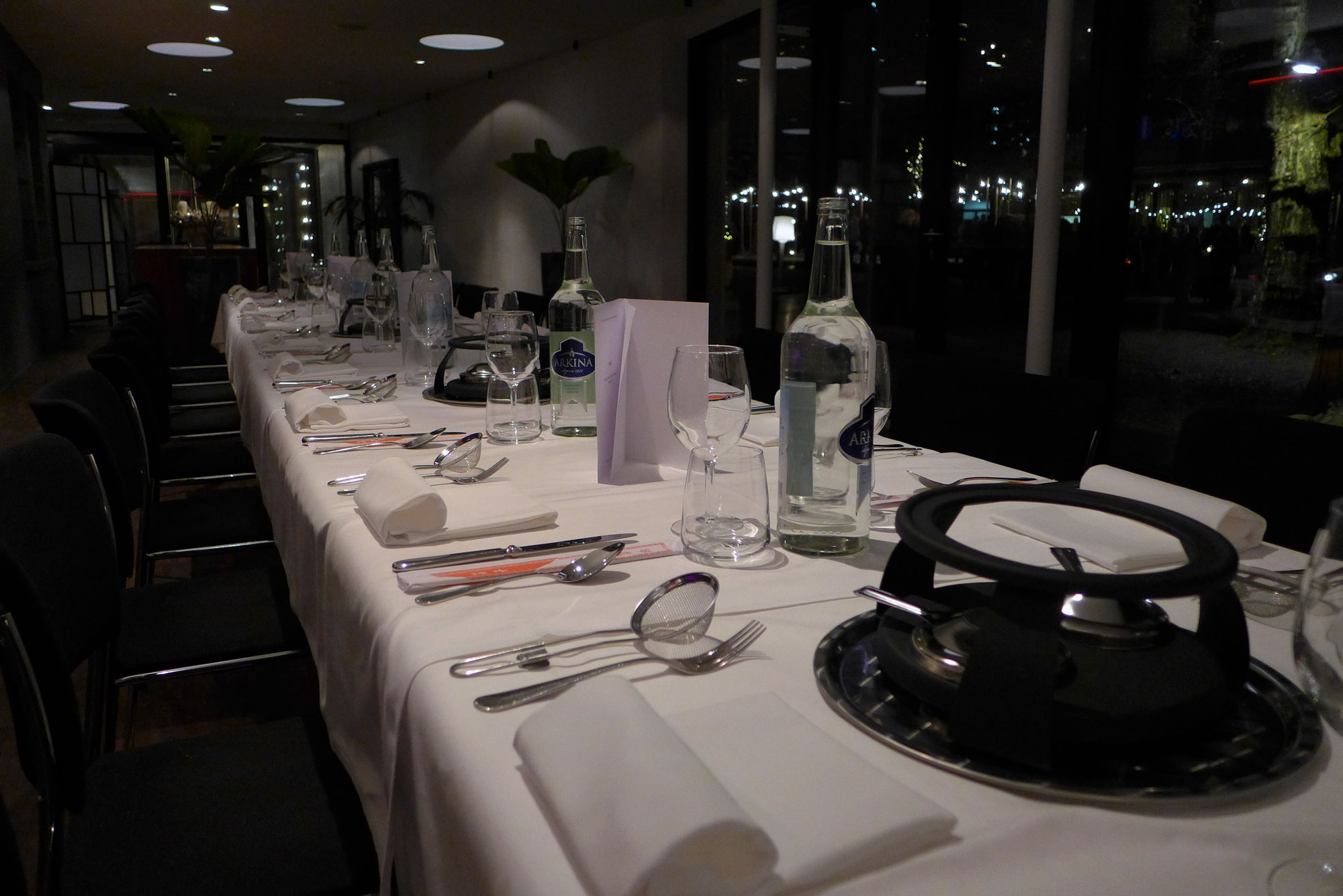 Nachdem die Siegerteams des Eisstock-Werfens erkoren sind, nimmt man Platz an der langen weissen Tafel. Der Apéro ist musikalisch begleitet von einem Appetizer-Set. Anschliessend kommt der Feuertopf – nicht besonders scharf, aber heiss. Unbarmherzig werden Fleisch, Pilze, Chabis und Tofu in der siedenden Brühe ertränkt. "Shabu shabu" nennt sich das. Musikalisch geht es nach dem Hauptgang mit dem zweiten, etwas ausgedehnteren Set weiter.