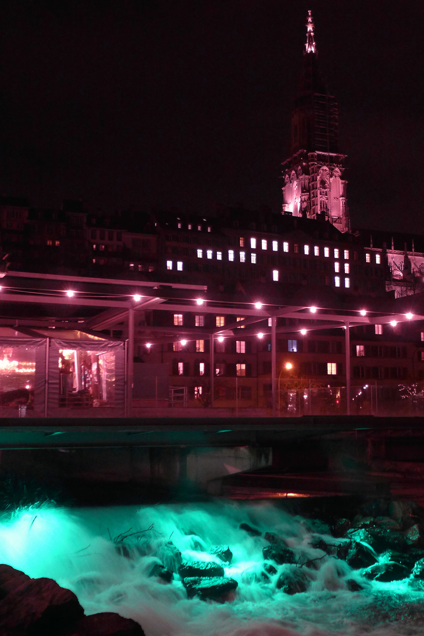 Während drinnen Fruchtsalat, Kaffee und Süssmostcrème serviert werden, plätschert draussen immer noch die beleuchtete Aare über die Schwelle. Dahinter das Münster. Nur die Stirnlampenjogger sind wohl mittlerweile an ihrem Ziel angekommen. Schön ist es hier auf dem Mätteli.